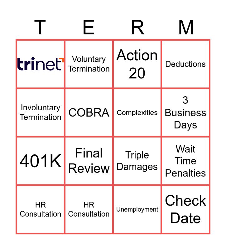 This bingo card has 1 images and 15 words: HR Consultation, HR Consultation, Action 20, Deductions, Involuntary Termination, Voluntary Termination, Triple Damages, Wait Time Penalties, COBRA, Unemployment, 3 Business Days, 401K, Final Review, Complexities and Check Date.
