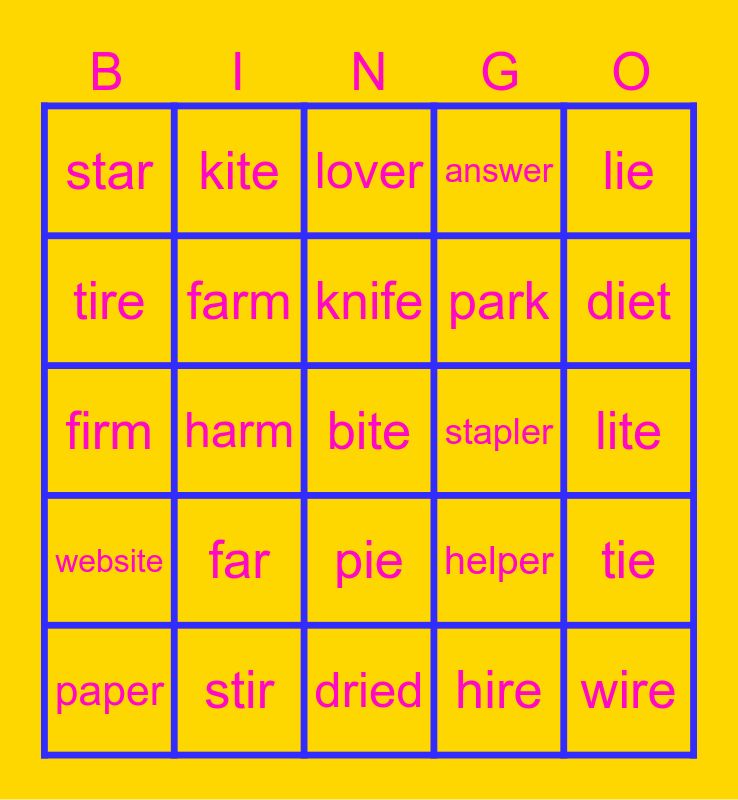 This bingo card has a free space and 24 words: far, stir, knife, paper, lie, star, tire, kite, stapler, pie, park, firm, helper, tie, farm, hire, lite, lover, diet, harm, wire, website, answer and dried.