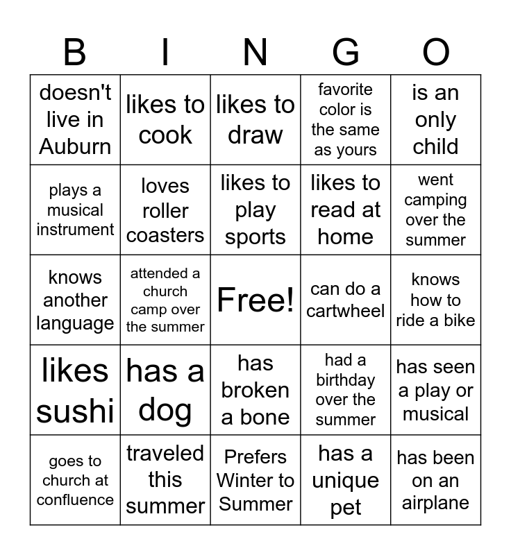 This bingo card has a free space and 24 words: has a dog, traveled this summer, likes to play sports, goes to church at confluence, is an only child, doesn't live in Auburn, plays a musical instrument, likes to cook, can do a cartwheel, has broken a bone, likes to read at home, knows another language, had a birthday over the summer, has seen a play or musical, loves roller coasters, has a unique pet, knows how to ride a bike, likes to draw, went camping over the summer, attended a church camp over the summer, has been on an airplane, likes sushi, favorite color is the same as yours and Prefers Winter to Summer.