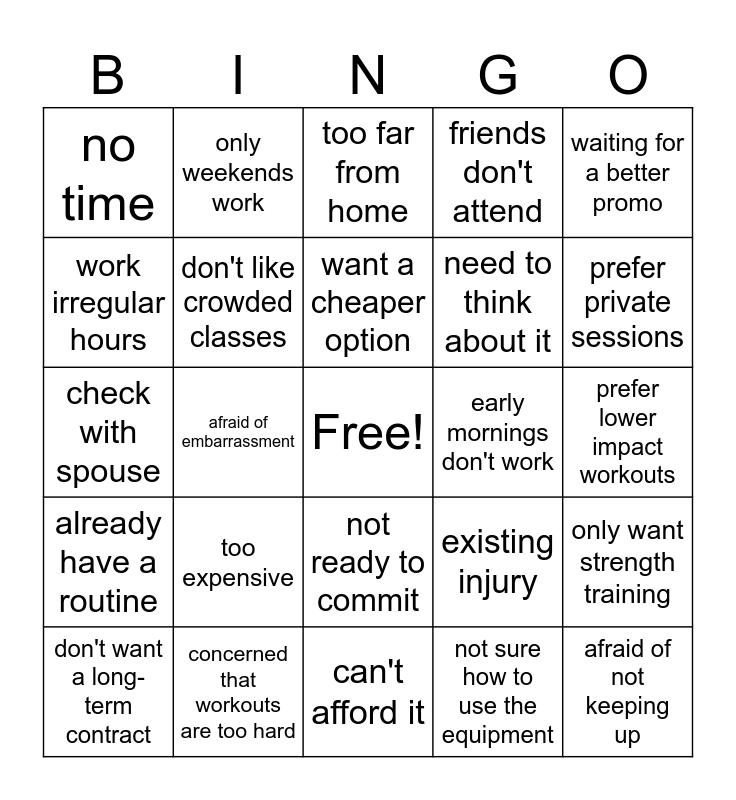 This bingo card has a free space and 25 words: too expensive, can't afford it, want a cheaper option, don't want a long-term contract, waiting for a better promo, no time, work irregular hours, only weekends work, early mornings don't work, not ready to commit, need to think about it, check with spouse, existing injury, only want strength training, don't like crowded classes, don't like loud music, prefer lower impact workouts, too far from home, prefer private sessions, afraid of embarrassment, afraid of not keeping up, concerned that workouts are too hard, already have a routine, friends don't attend and not sure how to use the equipment.