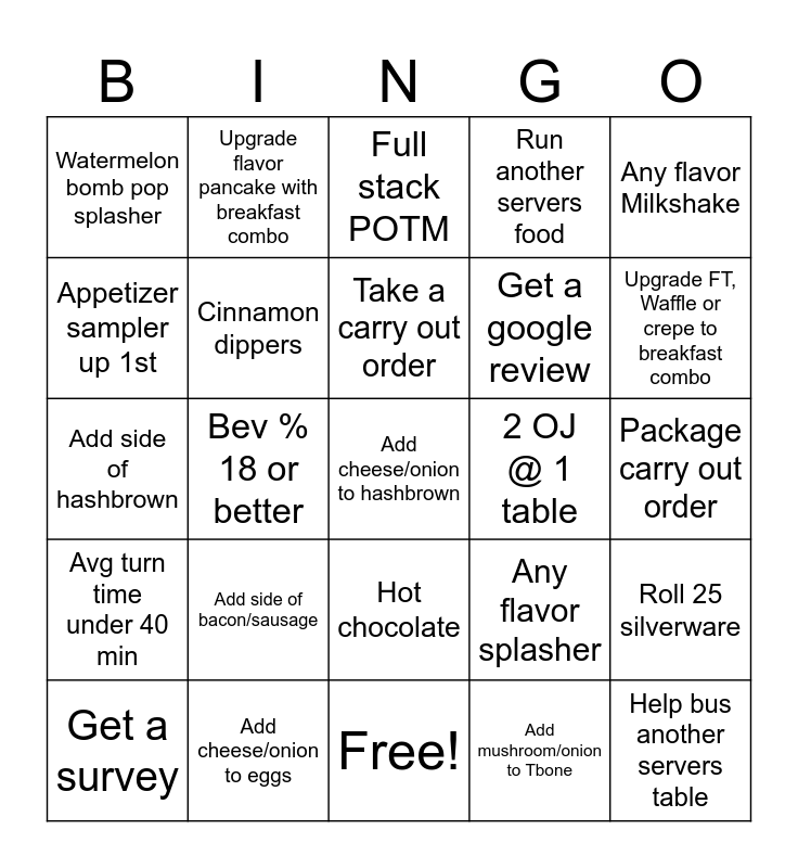 This bingo card has 25 words: Avg turn time under 40 min, Add cheese/onion to eggs, Add cheese/onion to hashbrown, Add mushroom/onion to Tbone, Any flavor Milkshake, Watermelon bomb pop splasher, Upgrade flavor pancake with breakfast combo, Full stack POTM, 2 OJ @ 1 table, Roll 25 silverware, Appetizer sampler up 1st, Cinnamon dippers, Free!, Any flavor splasher, Upgrade FT, Waffle or crepe to breakfast combo, Get a survey, Bev % 18 or better, Take a carry out order, Get a google review, Package carry out order, Add side of hashbrown, Add side of bacon/sausage, Hot chocolate, Run another servers food and Help bus another servers table.