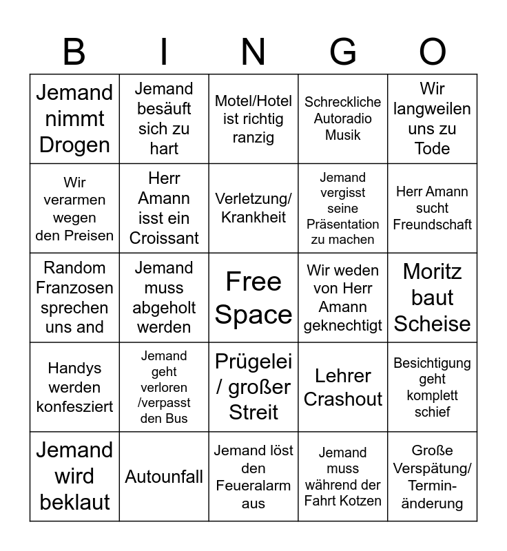 This bingo card has a free space and 24 words: Jemand geht verloren /verpasst den Bus, Autounfall, Verletzung/ Krankheit, Jemand wird beklaut, Wir langweilen uns zu Tode, Jemand nimmt Drogen, Wir verarmen wegen den Preisen, Jemand besäuft sich zu hart, Wir weden von Herr Amann geknechtigt, Prügelei / großer Streit, Jemand vergisst seine Präsentation zu machen, Random Franzosen sprechen uns and, Lehrer Crashout, Besichtigung geht komplett schief, Herr Amann isst ein Croissant, Jemand muss während der Fahrt Kotzen, Moritz baut Scheise, Motel/Hotel ist richtig ranzig, Herr Amann sucht Freundschaft, Jemand muss abgeholt werden, Große Verspätung/ Termin-änderung, Handys werden konfesziert, Schreckliche Autoradio Musik and Jemand löst den Feueralarm aus.