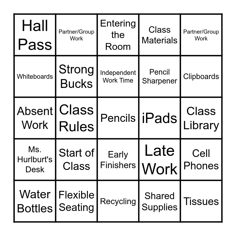 This bingo card has 25 words: Start of Class, Recycling, Independent Work Time, Water Bottles, Partner/Group Work, Hall Pass, Whiteboards, Partner/Group Work, iPads, Early Finishers, Pencil Sharpener, Absent Work, Late Work, Cell Phones, Strong Bucks, Tissues, Class Library, Entering the Room, Clipboards, Class Rules, Pencils, Flexible Seating, Ms. Hurlburt's Desk, Class Materials and Shared Supplies.
