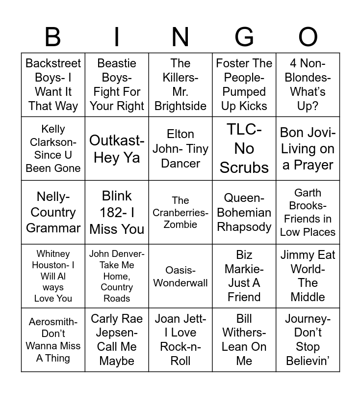 This bingo card has 29 words: Aerosmith- Don’t Wanna Miss A Thing, Neil Diamond- Sweet Caroline, Blink 182- I Miss You, Journey- Don’t Stop Believin’, Backstreet Boys- I Want It That Way, The Killers- Mr. Brightside, Outkast- Hey Ya, John Denver- Take Me Home, Country Roads, Queen- Bohemian Rhapsody, Carly Rae Jepsen- Call Me Maybe, Garth Brooks- Friends in Low Places, The Cranberries- Zombie, Joan Jett- I Love Rock-n-Roll, Bill Withers- Lean On Me, Bon Jovi- Living on a Prayer, Billy Joel- Piano Man, Oasis- Wonderwall, Whitney Houston- I Will Always Love You, 4 Non-Blondes- What’s Up?, Nelly- Country Grammar, Biz Markie- Just A Friend, NSYNCH- Bye, Bye, Bye, TLC- No Scrubs, Kelly Clarkson- Since U Been Gone, Foster The People- Pumped Up Kicks, Beastie Boys- Fight For Your Right, Jimmy Eat World- The Middle, Elton John- Tiny Dancer and Toto- Africa.