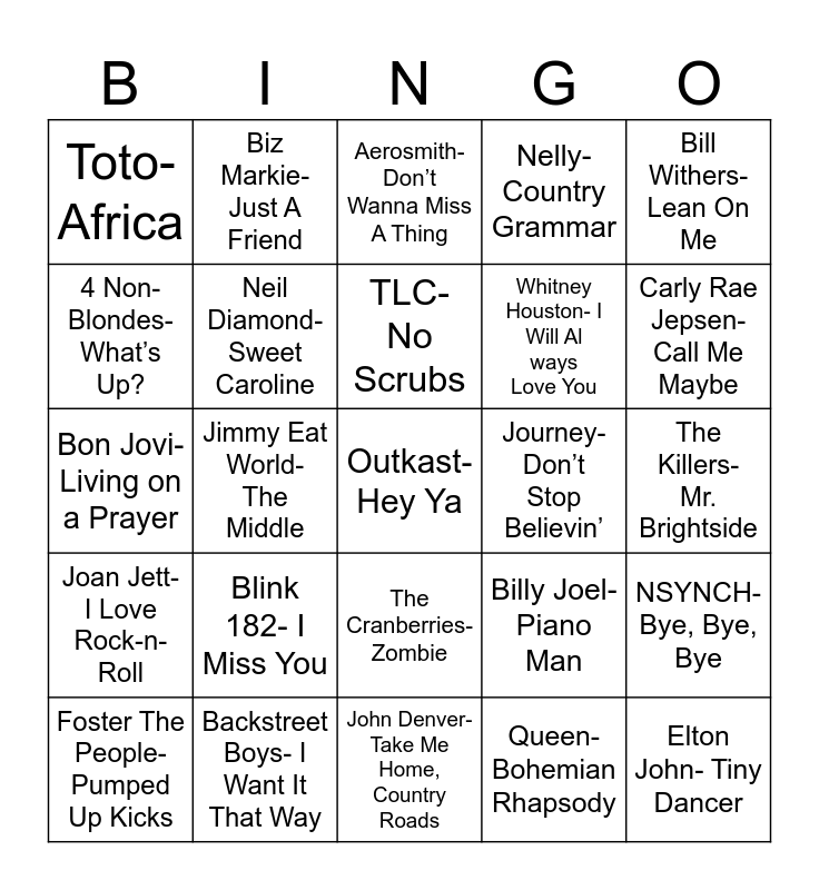 This bingo card has 29 words: Foster The People- Pumped Up Kicks, Beastie Boys- Fight For Your Right, Jimmy Eat World- The Middle, Elton John- Tiny Dancer, Toto- Africa, Aerosmith- Don’t Wanna Miss A Thing, Neil Diamond- Sweet Caroline, Blink 182- I Miss You, Journey- Don’t Stop Believin’, Backstreet Boys- I Want It That Way, The Killers- Mr. Brightside, Outkast- Hey Ya, John Denver- Take Me Home, Country Roads, Queen- Bohemian Rhapsody, Carly Rae Jepsen- Call Me Maybe, Garth Brooks- Friends in Low Places, The Cranberries- Zombie, Joan Jett- I Love Rock-n-Roll, Bill Withers- Lean On Me, Bon Jovi- Living on a Prayer, Billy Joel- Piano Man, Oasis- Wonderwall, Whitney Houston- I Will Always Love You, 4 Non-Blondes- What’s Up?, Nelly- Country Grammar, Biz Markie- Just A Friend, NSYNCH- Bye, Bye, Bye, TLC- No Scrubs and Kelly Clarkson- Since U Been Gone.