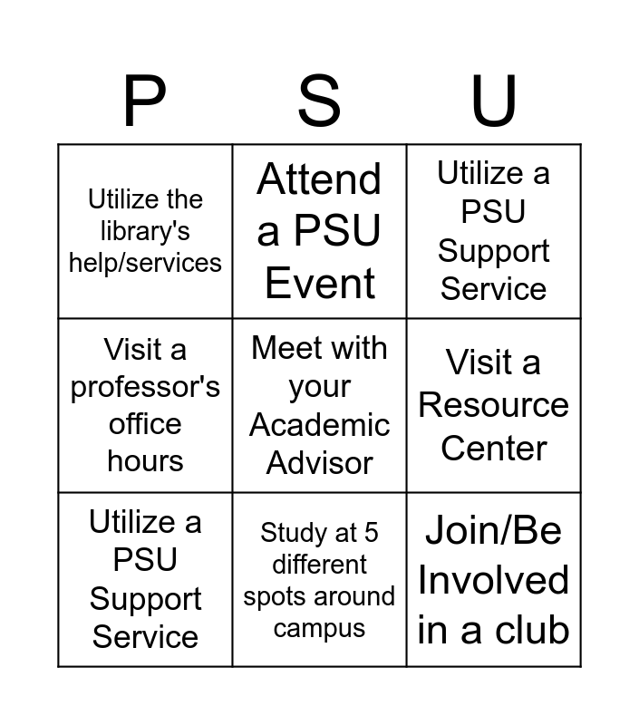 This bingo card has a free space and 8 words: Visit a Resource Center, Utilize a PSU Support Service, Attend a PSU Event, Utilize a PSU Support Service, Utilize the library's help/services, Join/Be Involved in a club, Visit a professor's office hours and Study at 5 different spots around campus.