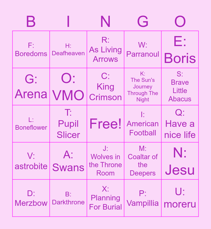 This bingo card has a free space and 24 words: A: Swans, B: Darkthrone, C: King Crimson, D: Merzbow, E: Boris, F: Boredoms, G: Arena, H: Deafheaven, I: American Football, J: Wolves in the Throne Room, K: The Sun's Journey Through The Night, L: Boneflower, M: Coaltar of the Deepers, N: Jesu, O: VMO, P: Vampillia, Q: Have a nice life, R: As Living Arrows, S: Brave Little Abacus, T: Pupil Slicer, U: moreru, V: astrobite, W: Parranoul and X: Planning For Burial.
