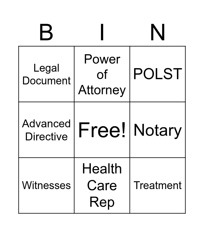 This bingo card has a free space and 8 words: Advanced Directive, Power of Attorney, Notary, Witnesses, POLST, Legal Document, Health Care Rep and Treatment.