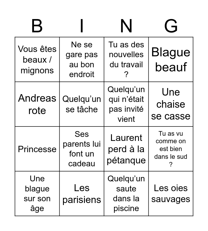 This bingo card has 16 words: Les parisiens, Tu as vu comme on est bien dans le sud ?, Tu as des nouvelles du travail ?, Vous êtes beaux / mignons, Princesse, Ne se gare pas au bon endroit, Laurent perd à la pétanque, Quelqu’un saute dans la piscine, Andreas rote, Quelqu’un se tâche, Une blague sur son âge, Blague beauf, Ses parents lui font un cadeau, Une chaise se casse, Quelqu’un qui n’était pas invité vient and Les oies sauvages.