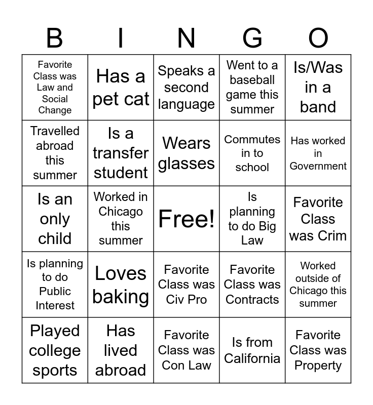 This bingo card has a free space and 34 words: Is a twin, Is from California, Is from Wisconsin, Is from Illinois, Is planning to do Public Interest, Is a transfer student, Is/Was in a band, Played college sports, Has a pet cat, Is scared of escalators, Wears glasses, Speaks a second language, Is a KJD, Isn't a KJD, Is planning to do Big Law, Has worked in Government, Has lived abroad, Is an only child, Loves baking, Favorite Class was Contracts, Favorite Class was Civ Pro, Favorite Class was BA, Favorite Class was Law and Social Change, Favorite Class was Crim, Favorite Class was Con Law, Favorite Class was Property, Went to a baseball game this summer, Is left handed, Commutes in to school, Travelled abroad this summer, Has been camping, Worked in Chicago this summer, Worked outside of Chicago this summer and Favorite class was First Amendment.