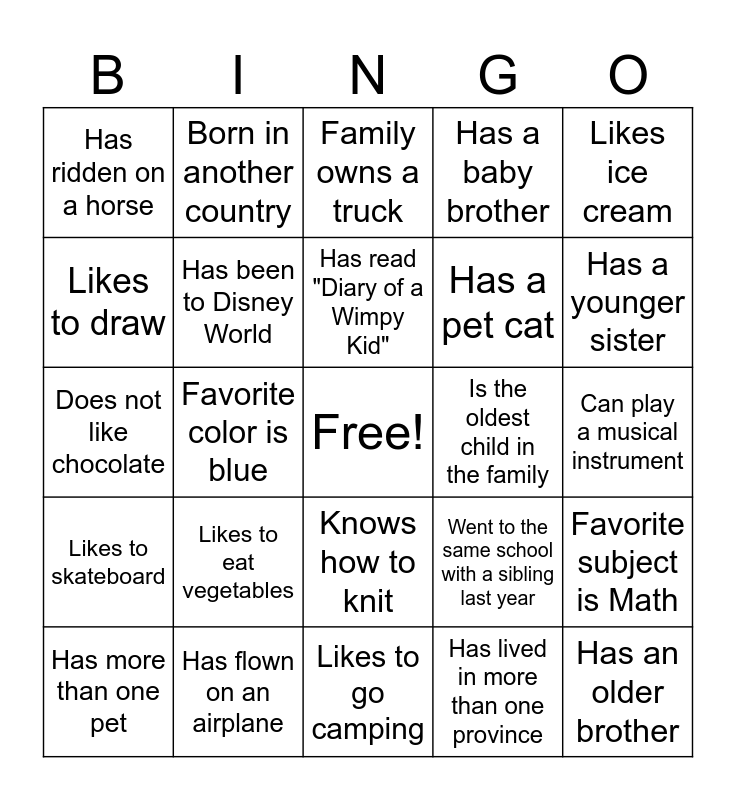 This bingo card has a free space and 24 words: Likes to eat vegetables, Has flown on an airplane, Has read "Diary of a Wimpy Kid", Has more than one pet, Likes ice cream, Has ridden on a horse, Likes to draw, Born in another country, Is the oldest child in the family, Knows how to knit, Has a pet cat, Does not like chocolate, Went to the same school with a sibling last year, Favorite subject is Math, Has been to Disney World, Has lived in more than one province, Can play a musical instrument, Family owns a truck, Has a younger sister, Favorite color is blue, Has an older brother, Likes to skateboard, Has a baby brother and Likes to go camping.