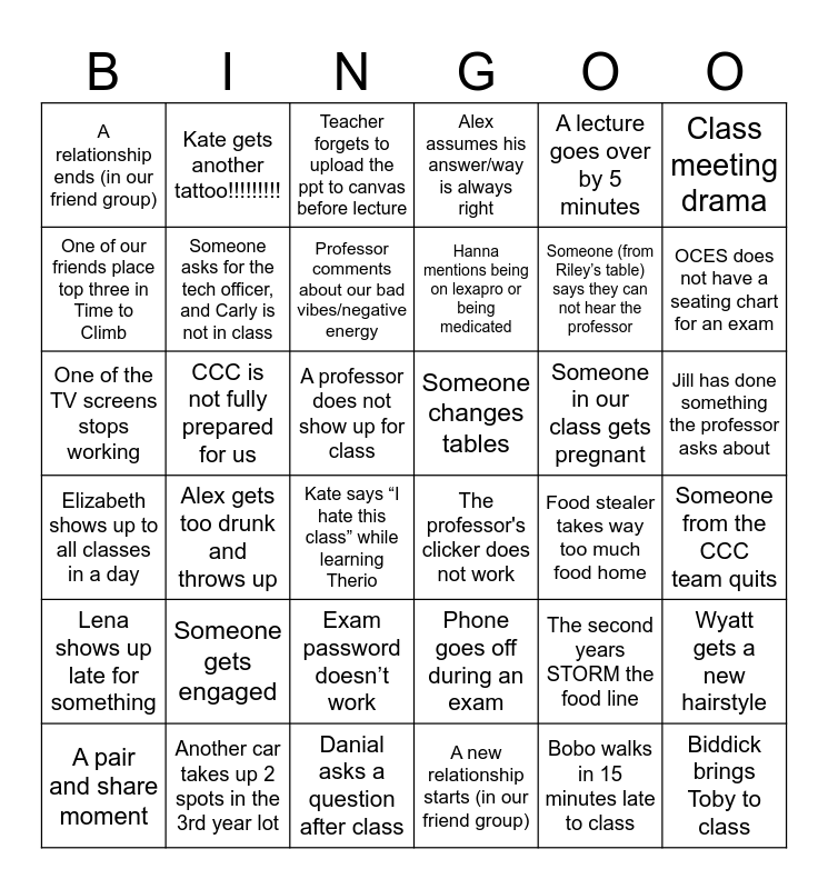 This bingo card has 40 words: Danial asks a question after class, Someone (from Riley’s table) says they can not hear the professor, Elyse makes an unprovoked comment, One of our friends place top three in Time to Climb, The professor's clicker does not work, Jill has done something the professor asks about, Someone asks for the tech officer, and Carly is not in class, Hanna and Alex fight, A lecture goes over by 5 minutes, Someone changes tables, OCES does not have a seating chart for an exam, Alex assumes his answer/way is always right, One of the TV screens stops working, A professor does not show up for class, CCC is not fully prepared for us, Someone in our class gets pregnant, Wyatt gets a new hairstyle, A relationship ends (in our friend group), A new relationship starts (in our friend group), Teacher forgets to upload the ppt to canvas before lecture, Alex gets too drunk and throws up, Someone from the CCC team quits, Professor comments about our bad vibes/negative energy, Class meeting drama, Bobo walks in 15 minutes late to class, Phone goes off during an exam, Someone gets engaged, Biddick brings Toby to class, Lena shows up late for something, Exam password doesn’t work, Low on an exam is under 30%, Kate says “I hate this class” while learning Therio, A pair and share moment, Elizabeth shows up to all classes in a day, Hanna mentions being on lexapro or being medicated, Food stealer takes way too much food home, The second years STORM the food line, Another car takes up 2 spots in the 3rd year lot, Kate gets another tattoo!!!!!!!!! and Brooke or Kate gets another cat.