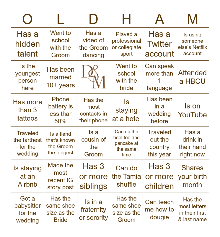This bingo card has 1 images and 35 words: Traveled the farthest for the wedding, Is a fiend that's known the Groom the longest, Is in a fraternity or sorority, Went to school with the bride, Has been in a wedding before, Is on YouTube, Has a hidden talent, Has the same shoe size as the Bride, Has a video of the Groom dancing, Can do the Tamia shuffle, Can speak more than 1 language, Is using someone else's Netflix account, Is staying at an Airbnb, Phone battery is less than 50%, Played a professional or collegiate sport, Has 3 or more children, Has a drink in their hand right now, Is the youngest person here, Has been married 10+ years, Is a cousin of the Groom, Can do the heel toe and pancake at the same time, Traveled out the country this year, Shares your birth month, Has more than 3 tattoos, Went to school with the Groom, Has the most contacts in their phone, Has the same shoe size as the Groom, Has a Twitter account, Attended a HBCU, Got a babysitter for the wedding, Made the most recent IG story post, Has 3 or more siblings, Is staying at a hotel, Can teach me how to dougie and Has the most letters in their first & last name.