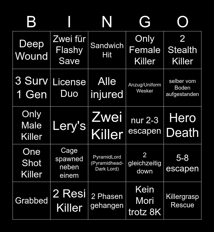 This bingo card has a free space and 27 words: 2 gleichzeitig down, Killer passt zur Map, Anzug/Uniform Wesker, 2 Phasen gehangen, 3 Surv 1 Gen, Sandwich Hit, Zwei für Flashy Save, One Shot Killer, nur 2-3 escapen, 5-8 escapen, Only Male Killer, Only Female Killer, Grabbed, 2 Resi Killer, selber vom Boden aufgestanden, 4 zum heilen, License Duo, Alle injured, Cage spawned neben einem, Deep Wound, Hero Death, Kein Mori trotz 8K, Lery's, Killergrasp Rescue, PyramidLord (Pyramidhead-Dark Lord), 2 Stealth Killer and Cage wird geported.