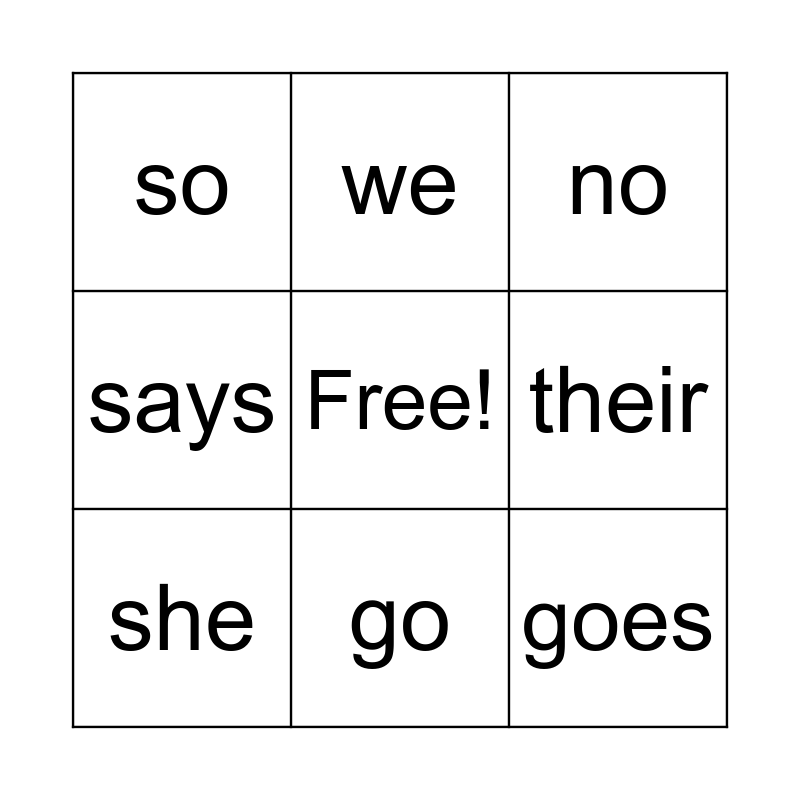 This bingo card has a free space and 10 words: go, no, so, goes, says, she, we, they, their and were.
