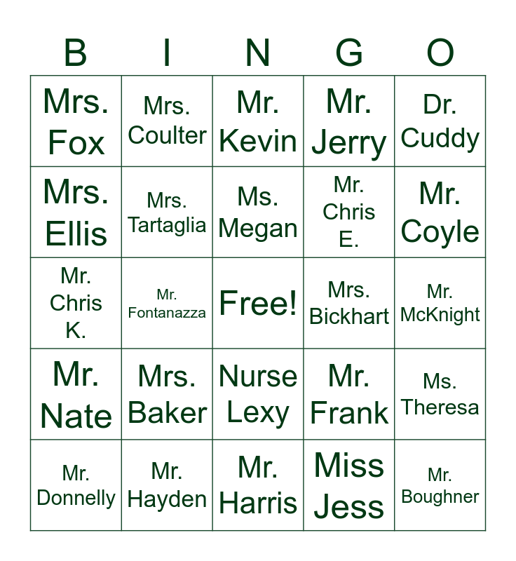 This bingo card has a free space and 26 words: Nurse Lexy, Miss Jess, Ms. Megan, Mr. Hayden, Dr. Cuddy, Mrs. Fox, Mrs. Ellis, Mrs. Coulter, Mr. McKnight, Mr. Frank, Mr. Chris E., Mr. Chris K., Ms. Theresa, Mr. Donnelly, Mr. Fontanazza, Mr. Jay, Mr. Jerry, Mr. Nate, Mr. Kevin, Mr. Boughner, Mr. Coyle, Mr. Harris, Mrs. Bickhart, Mrs. Baker, Mrs. Tartaglia and Mrs. McAndrew.