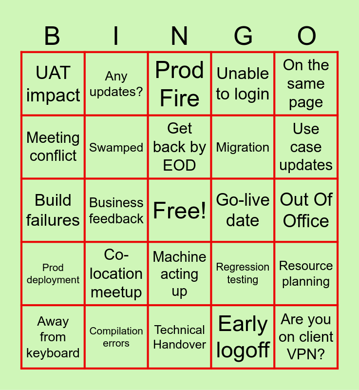 This bingo card has a free space and 90 words: Can you hear me?, Wrong window, Machine acting up, Screen froze, You are on mute, Be right back, On client call, Dropping off for another call, Last minute request, Dev plan, Revisit timelines, Code revamp, Connectivity issue, Out Of Office, Need to step away, Get back by EOD, Client escalation, Release pipeline, Trackwise updates, Closeout activities, Day0 activities, DB package review, Technical Handover, Demo calls, Build failures, Compilation errors, GitHub support, CQ is down, Joining in 5 mins, Needed on call?, You are free to drop, Resource planning, Design walkthrough, Prod deployment, UAT impact, Unable to login, Prod Fire, M&O Unique issues, Business feedback, Use case updates, Away from keyboard, Meeting conflict, Merge conflicts, Modified files, Mock deployment, Regression testing, CAB approval, Artifacts submission, Code stream lock, Pub file deployment, Rules deployment, Migration, Environment refresh, Power BI, ControlM Schedule, Go/No-Go decision, Go-live date, Let's connect offline, Weekend support, Post-prod monitoring, SQL cost validation, Veracode scan, SpotBugs, WS issues, Long running queries, Performance tuning, AppD logs, Early logoff, New SLAs, Sick day off, Co-location meetup, Are you on client VPN?, Call me on Teams, Daily stand-up, Any updates?, Swamped, PII data, Meeting minutes, Lunch break, PTO request, Low-hanging fruit, On the same page, Out of scope, Bandwidth constraints, Stakeholders, Action items, VaCMS, Roadmap, Remote work and Quick question.