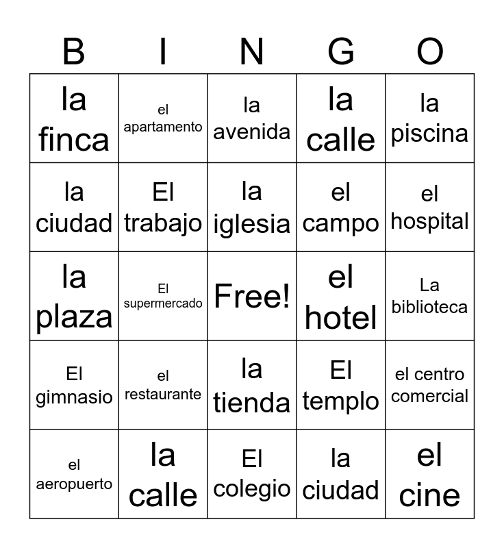 This bingo card has a free space and 24 words: el restaurante, la calle, la iglesia, el aeropuerto, la piscina, la finca, la ciudad, el apartamento, el hotel, la tienda, el campo, la plaza, El templo, el centro comercial, El trabajo, la ciudad, La biblioteca, la avenida, el hospital, El supermercado, el cine, El gimnasio, la calle and El colegio.