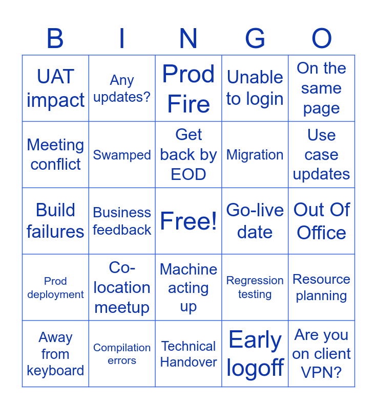 This bingo card has a free space and 90 words: Can you hear me?, Wrong window, Machine acting up, Screen froze, You are on mute, Be right back, On client call, Dropping off for another call, Last minute request, Dev plan, Revisit timelines, Code revamp, Connectivity issue, Out Of Office, Need to step away, Get back by EOD, Client escalation, Release pipeline, Trackwise updates, Closeout activities, Day0 activities, DB package review, Technical Handover, Demo calls, Build failures, Compilation errors, GitHub support, CQ is down, Joining in 5 mins, Needed on call?, You are free to drop, Resource planning, Design walkthrough, Prod deployment, UAT impact, Unable to login, Prod Fire, M&O Unique issues, Business feedback, Use case updates, Away from keyboard, Meeting conflict, Merge conflicts, Modified files, Mock deployment, Regression testing, CAB approval, Artifacts submission, Code stream lock, Pub file deployment, Rules deployment, Migration, Environment refresh, Power BI, ControlM Schedule, Go/No-Go decision, Go-live date, Let's connect offline, Weekend support, Post-prod monitoring, SQL cost validation, Veracode scan, SpotBugs, WS issues, Long running queries, Performance tuning, AppD logs, Early logoff, New SLAs, Sick day off, Co-location meetup, Are you on client VPN?, Call me on Teams, Daily stand-up, Any updates?, Swamped, PII data, Meeting minutes, Lunch break, PTO request, Low-hanging fruit, On the same page, Out of scope, Bandwidth constraints, Stakeholders, Action items, VaCMS, Roadmap, Remote work and Quick question.