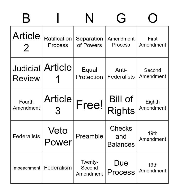 This bingo card has a free space and 24 words: Veto Power, Federalism, Equal Protection, Impeachment, First Amendment, Article 2, Judicial Review, Ratification Process, Bill of Rights, Preamble, Anti-Federalists, Fourth Amendment, Checks and Balances, 19th Amendment, Article 1, Due Process, Eighth Amendment, Separation of Powers, Second Amendment, Article 3, 13th Amendment, Federalists, Amendment Process and Twenty-Second Amendment.