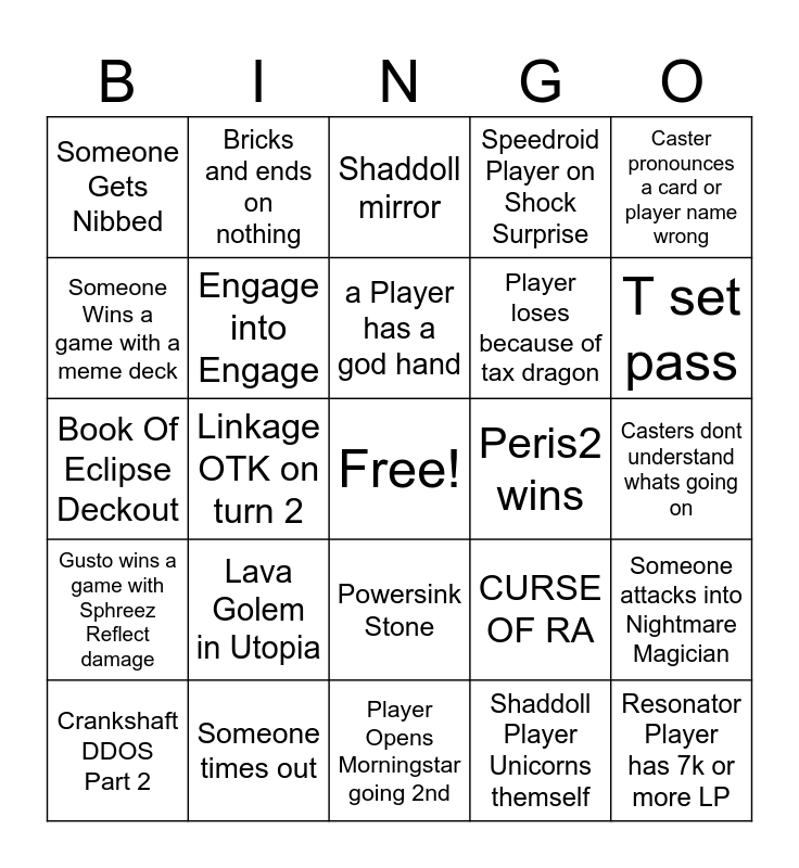 This bingo card has a free space and 24 words: Lava Golem in Utopia, Someone times out, a Player has a god hand, Crankshaft DDOS Part 2, Caster pronounces a card or player name wrong, Someone Gets Nibbed, Someone Wins a game with a meme deck, Bricks and ends on nothing, Peris2 wins, Powersink Stone, Player loses because of tax dragon, Book Of Eclipse Deckout, CURSE OF RA, Someone attacks into Nightmare Magician, Engage into Engage, Shaddoll Player Unicorns themself, Casters dont understand whats going on, Shaddoll mirror, T set pass, Linkage OTK on turn 2, Resonator Player has 7k or more LP, Gusto wins a game with Sphreez Reflect damage, Speedroid Player on Shock Surprise and Player Opens Morningstar going 2nd.