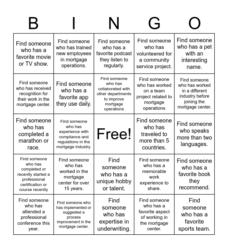 This bingo card has a free space and 24 words: Find someone who has worked in the mortgage center for over 15 years., Find someone who has implemented or suggested a process improvement in the mortgage center., Find someone who has collaborated with other departments to improve mortgage operations, Find someone who has attended a professional conference this year., Find someone who has a pet with an interesting name., Find someone who has a favorite movie or TV show., Find someone who has received recognition for their work in the mortgage center., Find someone who has trained new employees in mortgage operations., Find someone who has traveled to more than 5 countries., Find someone who has a unique hobby or talent., Find someone who has worked on a team project related to mortgage operations, Find someone who has completed a marathon or race., Find someone who has a memorable work experience to share., Find someone who has a favorite book they recommend., Find someone who has a favorite app they use daily., Find someone who has a favorite aspect of working in the mortgage center., Find someone who speaks more than two languages., Find someone who has a favorite podcast they listen to regularly., Find someone who has worked in a different industry before joining the mortgage center., Find someone who has experience with compliance and regulations in the mortgage industry., Find someone who has a favorite sports team., Find someone who has completed or recently started a professional certification or course recently, Find someone who has volunteered for a community service project. and Find someone who has expertise in underwriting..