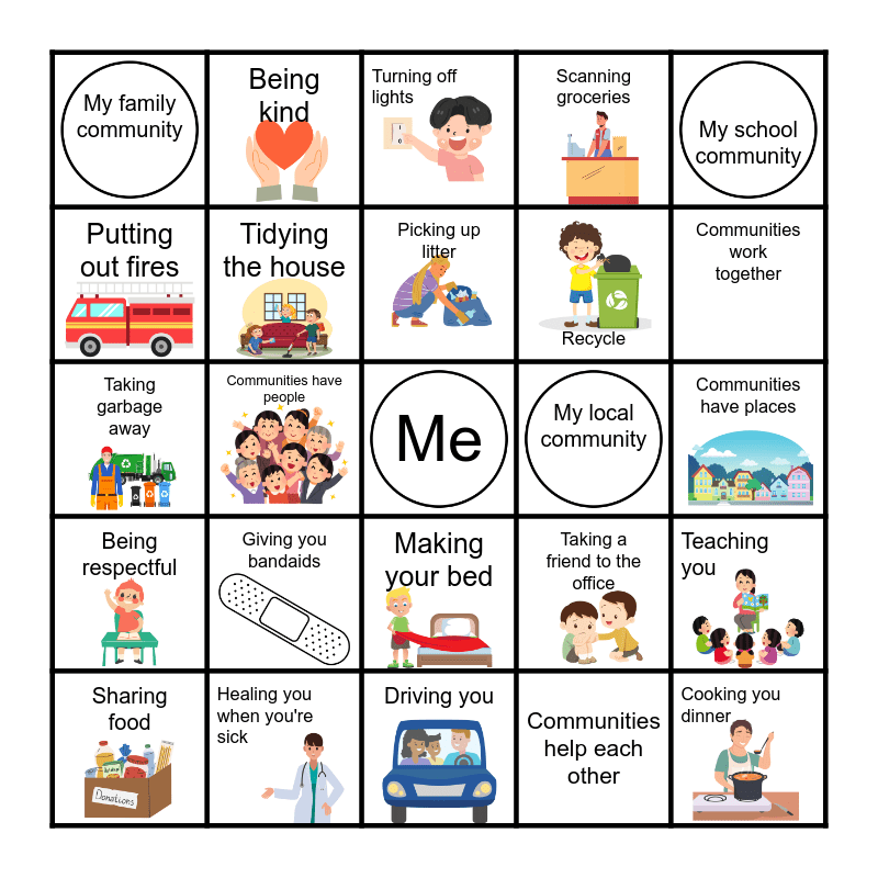 This bingo card has 23 images, a free space and 26 words: Making your bed, Communities help each other, Picking up litter, Healing you when you're sick, My school community, My family community, Putting out fires, Being kind, Communities have places, Taking a friend to the office, Recycle, Taking garbage away, Teaching you, Sharing food, Communities have people, Doing cleanup jobs, Scanning groceries, Being respectful, Turning off lights, Cooking you dinner, Communities work together, Driving you, My local community, Giving you bandaids, Tidying the house and Word.