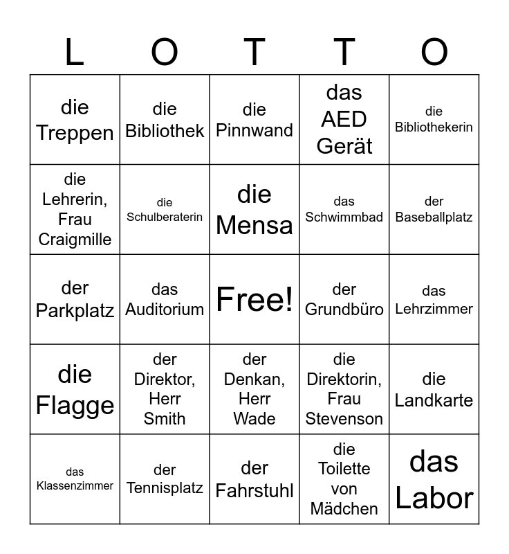 This bingo card has a free space and 34 words: die Toilette von allen, die Toilette von Mädchen, die Toilette von Jungen, der Trinkbrunnen, die Flagge, die Schulberaterin, die Bibliothekerin, das Klassenzimmer, die Bibliothek, das Klassenzimmer, die Mensa, die Pinnwand, der Gang, das Schließfach, der Grundbüro, der Baseballplatz, der Tennisplatz, der Parkplatz, der Direktor, Herr Smith, die Direktorin, Frau Stevenson, der Denkan, Herr Wade, der Notausgang, die Treppen, das Lehrzimmer, der Fahrstuhl, das Labor, das AED Gerät, die Turnhalle, das Schwimmbad, die Lehrerin, Frau Craigmille, der Direktorsbüro, das Auditorium, die Landkarte and das Handesinfektionsmittel.