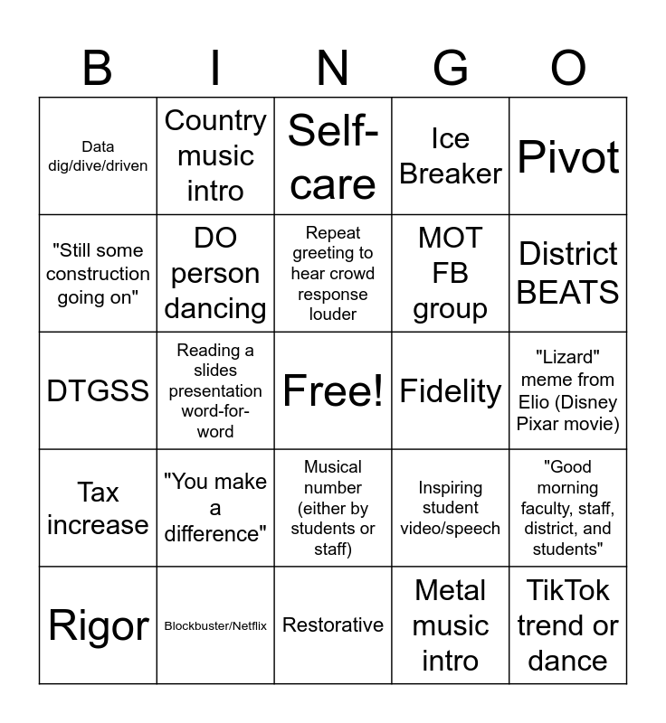 This bingo card has a free space and 38 words: K-Pop Demon Hunters reference, "Best district in the state", S.Wong screams at least 3 separate times, DO person dancing, "Good morning faculty, staff, district, and students", "You make a difference", Repeat greeting to hear crowd response louder, Tech/sound not working during presentations, Pivot, MOT FB group, Reading a slides presentation word-for-word, Ice Breaker, TikTok trend or dance, "Lizard" meme from Elio (Disney Pixar movie), "Still some construction going on", Tax increase, Student cell phones, Self-care, Remember your why, Fidelity, Data dig/dive/driven, Blockbuster/Netflix, District BEATS, Rigor, Rapid growth (of MOT area), Restorative, MTSS, Support facilitation, Grace, patience, SEL, “We’re a family”, Musical number (either by students or staff), Metal music intro, Country music intro, Pop music intro, Inspiring student video/speech, DTGSS and Navigating the traffic circle at Fairview campus.