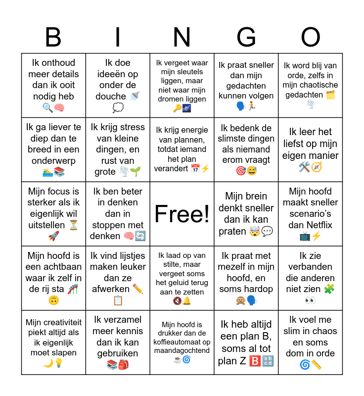 This bingo card has a free space and 25 words: Ik vind lijstjes maken leuker dan ze afwerken βοΈπ, Mijn hoofd is drukker dan de koffieautomaat op maandagochtend βοΈπ, Ik krijg energie van plannen, totdat iemand het plan verandert π β‘, Mijn creativiteit piekt altijd als ik eigenlijk moet slapen ππ‘, Ik word blij van orde, zelfs in mijn chaotische gedachten ποΈπͺοΈ, Ik onthoud meer details dan ik ooit nodig heb ππ§ , Ik ga liever te diep dan te breed in een onderwerp πββοΈπ, Ik doe ideeΓ«n op onder de douche πΏπ, Mijn brein denkt sneller dan ik kan praten π€―π¬, Ik laad op van stilte, maar vergeet soms het geluid terug aan te zetten ππ, Ik bedenk de slimste dingen als niemand erom vraagt π―π , Mijn focus is sterker als ik eigenlijk wil uitstellen β³π, Ik praat met mezelf in mijn hoofd, en soms hardop ππ£οΈ, Ik zie verbanden die anderen niet zien π§©π, Ik krijg stress van kleine dingen, en rust van grote πͺοΈπ±, Ik heb meer ideeΓ«n dan ik ooit kan uitvoeren π‘π¦, Mijn hoofd maakt sneller scenarioβs dan Netflix πΊβ‘, Ik vergeet waar mijn sleutels liggen, maar niet waar mijn dromen liggen ππ, Ik leer het liefst op mijn eigen manier π οΈπ§, Ik ben beter in denken dan in stoppen met denken π§ π, Ik voel me slim in chaos en soms dom in orde ππ, Ik verzamel meer kennis dan ik kan gebruiken ππ, Mijn hoofd is een achtbaan waar ik zelf in de rij sta π’π, Ik praat sneller dan mijn gedachten kunnen volgen π£οΈπ and Ik heb altijd een plan B, soms al tot plan Z π ±οΈπ‘.
