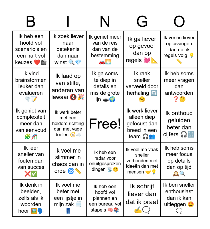 This bingo card has a free space and 26 words: Ik heb een radar voor onuitgesproken dingen π‘π€«, Ik schrijf liever dan dat ik praat βοΈπ¨οΈ, Ik ga soms te diep in details en mis de grote lijn π³οΈπ, Ik voel me beter met een lijstje in mijn zak ποΈπ, Ik verzin liever oplossingen dan dat ik regels volg π‘π, Ik heb een hoofd vol scenarioβs en een hart vol keuzes β€οΈπ¬, Ik vind brainstormen leuker dan evalueren πͺοΈπ, Ik zoek liever naar betekenis dan naar winst ππ, Ik onthoud geluiden beter dan cijfers π§π’, Ik voel me vaak sneller verbonden met ideeΓ«n dan met mensen π€π‘, Ik raak sneller verveeld door herhaling ππ₯±, Ik geniet van complexiteit meer dan van eenvoud π§©π’, Ik heb soms meer focus op details dan op tijd π°οΈπ, Ik denk in beelden, zelfs als ik woorden hoor πΌοΈπ£οΈ, Ik werk beter met een heldere richting dan met vage doelen π§βοΈ, Ik voel me creatiever als ik niets moet π¨π«, Ik ga liever op gevoel dan op regels ππ, Ik leer sneller van fouten dan van succes ββ , Ik geniet meer van de reis dan van de bestemming ππ , Ik ben sneller enthousiast dan ik kan uitleggen π€©π¨οΈ, Ik heb soms meer vragen dan antwoorden βπ€, Ik heb een hoofd vol plannen en een bureau vol stapels π§ π, Ik werk liever alleen diep gefocust dan breed in een team π§π₯, Ik voel me slimmer in chaos dan in orde ππ, Ik laad op van stilte, anderen van lawaai ππ and Ik denk vaak: 'hou je mond' als iemand veel praat ππ.