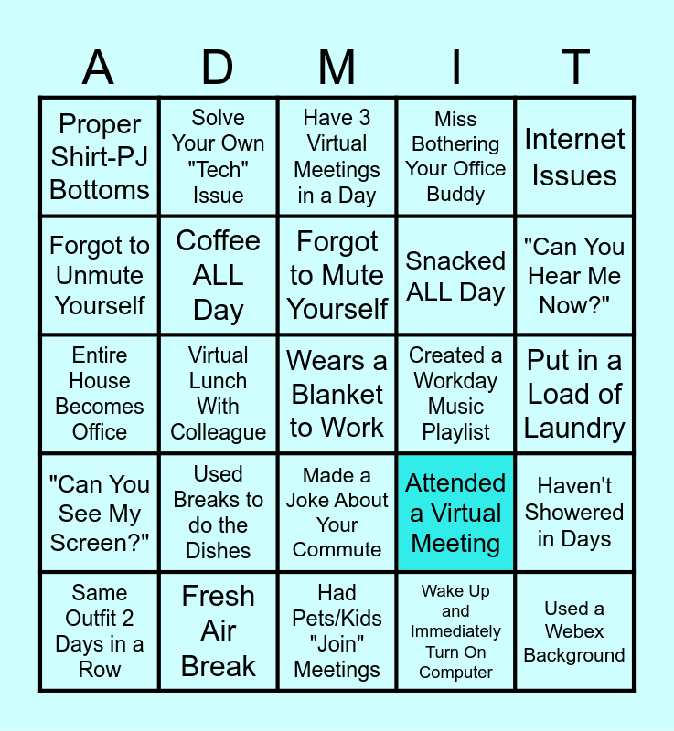 This bingo card has 25 words: Used Breaks to do the Dishes, Had Pets/Kids "Join" Meetings, Forgot to Mute Yourself, Same Outfit 2 Days in a Row, Internet Issues, Proper Shirt-PJ Bottoms, Forgot to Unmute Yourself, Solve Your Own "Tech" Issue, Created a Workday Music Playlist, Made a Joke About Your Commute, Snacked ALL Day, Entire House Becomes Office, Attended a Virtual Meeting, Haven't Showered in Days, Coffee ALL Day, Used a Webex Background, Put in a Load of Laundry, Have 3 Virtual Meetings in a Day, "Can You Hear Me Now?", Virtual Lunch With Colleague, Wears a Blanket to Work, Fresh Air Break, "Can You See My Screen?", Miss Bothering Your Office Buddy and Wake Up and Immediately Turn On Computer.