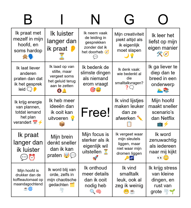 This bingo card has a free space and 28 words: Ik word zenuwachtig als iedereen naar mij kijkt ππ³, Ik voel me fijn in de spotlight π€β¨, Ik denk vaak: wie bedenkt al die smalltalkvragen? βπ¨οΈ, Ik vind smalltalk leuk, ook al zeg ik weinig πβ, Ik laat liever anderen praten dan dat ik het gesprek leid π¨οΈπ, Ik neem vaak de leiding in gesprekken zonder dat ik het doorheb π§π¬, Ik luister langer dan ik praat πβ³, Ik praat langer dan ik luister π¬β°, Ik vind lijstjes maken leuker dan ze afwerken βοΈπ, Mijn hoofd is drukker dan de koffieautomaat op maandagochtend βοΈπ, Ik krijg energie van plannen, totdat iemand het plan verandert π β‘, Mijn creativiteit piekt altijd als ik eigenlijk moet slapen ππ‘, Ik word blij van orde, zelfs in mijn chaotische gedachten ποΈπͺοΈ, Ik onthoud meer details dan ik ooit nodig heb ππ§ , Ik ga liever te diep dan te breed in een onderwerp πββοΈπ, Ik doe ideeΓ«n op onder de douche πΏπ, Mijn brein denkt sneller dan ik kan praten π€―π¬, Ik laad op van stilte, maar vergeet soms het geluid terug aan te zetten ππ, Ik bedenk de slimste dingen als niemand erom vraagt π―π , Mijn focus is sterker als ik eigenlijk wil uitstellen β³π, Ik praat met mezelf in mijn hoofd, en soms hardop ππ£οΈ, Ik zie verbanden die anderen niet zien π§©π, Ik krijg stress van kleine dingen, en rust van grote πͺοΈπ±, Ik heb meer ideeΓ«n dan ik ooit kan uitvoeren π‘π¦, Mijn hoofd maakt sneller scenarioβs dan Netflix πΊβ‘, Ik vergeet waar mijn sleutels liggen, maar niet waar mijn dromen liggen ππ, Ik leer het liefst op mijn eigen manier π οΈπ§ and Ik ben beter in denken dan in stoppen met denken π§ π.