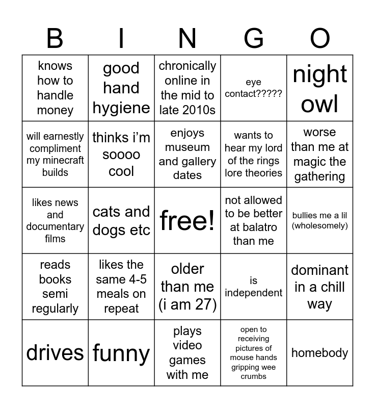 This bingo card has a free space and 24 words: likes the same 4-5 meals on repeat, funny, enjoys museum and gallery dates, drives, night owl, knows how to handle money, will earnestly compliment my minecraft builds, good hand hygiene, not allowed to be better at balatro than me, older than me (i am 27), wants to hear my lord of the rings lore theories, likes news and documentary films, is independent, dominant in a chill way, thinks i’m soooo cool, open to receiving pictures of mouse hands gripping wee crumbs, bullies me a lil (wholesomely), chronically online in the mid to late 2010s, worse than me at magic the gathering, cats and dogs etc, homebody, reads books semi regularly, eye contact????? and plays video games with me.