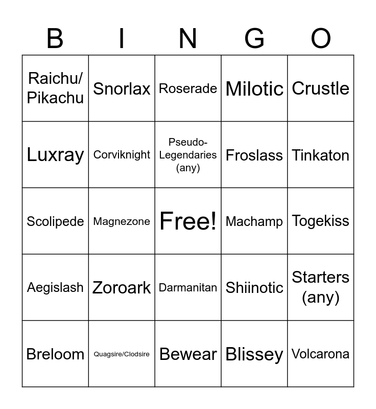 This bingo card has a free space and 24 words: Zoroark, Quagsire/Clodsire, Pseudo-Legendaries (any), Breloom, Crustle, Raichu/ Pikachu, Luxray, Snorlax, Machamp, Darmanitan, Froslass, Scolipede, Shiinotic, Starters (any), Corviknight, Blissey, Togekiss, Roserade, Tinkaton, Magnezone, Volcarona, Aegislash, Milotic and Bewear.