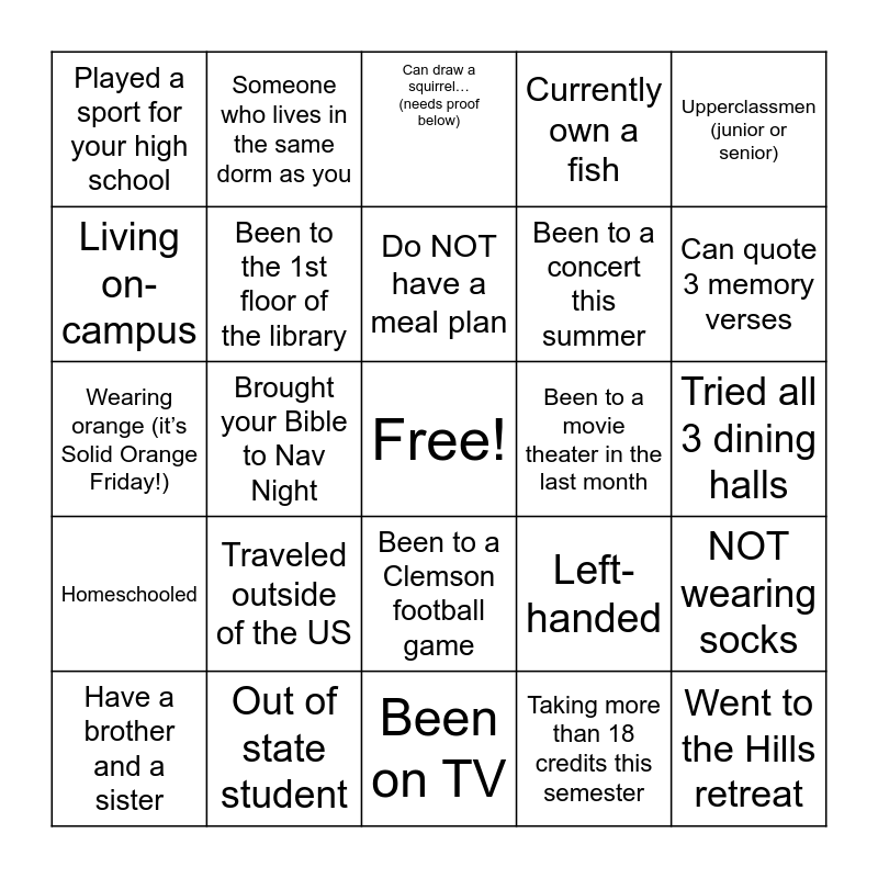 This bingo card has a free space and 24 words: Traveled outside of the US, Out of state student, Do NOT have a meal plan, Have a brother and a sister, Upperclassmen (junior or senior), Played a sport for your high school, Living on-campus, Someone who lives in the same dorm as you, Been to a movie theater in the last month, Been to a Clemson football game, Been to a concert this summer, Wearing orange (it’s Solid Orange Friday!), Left-handed, NOT wearing socks, Been to the 1st floor of the library, Taking more than 18 credits this semester, Tried all 3 dining halls, Can draw a squirrel… (needs proof below), Can quote 3 memory verses, Brought your Bible to Nav Night, Went to the Hills retreat, Homeschooled, Currently own a fish and Been on TV.