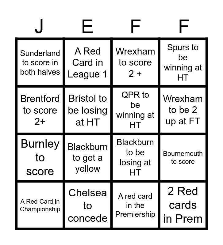 This bingo card has 20 words: Bournemouth to score, Everton to concede 1 before half time, Wrexham to score 2 +, Newcastle to score, A Red Card in Championship, Brentford to score 2+, Chelsea to concede, Sunderland to score in both halves, Burnley to score, A Red Card in League 1, Blackburn to get a yellow, Blackburn to be losing at HT, Bristol to be losing at HT, 2 Red cards in Prem, QPR to be winning at HT, Millwall to concede 2+ in one half, Wrexham to be 2 up at FT, Spurs to be winning at HT, A red card in the Premiership and Man City to Concede in the second half.