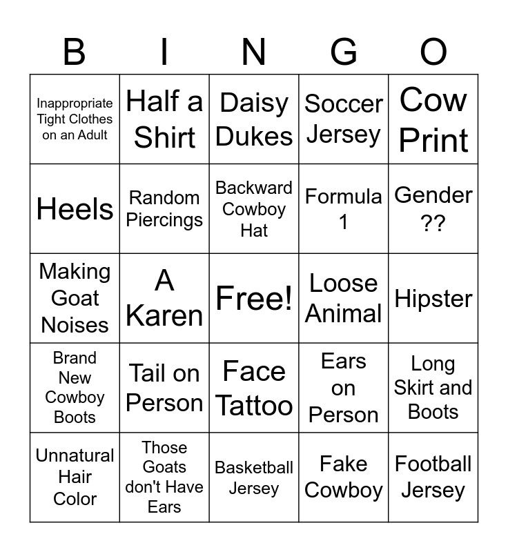 This bingo card has a free space and 34 words: Fake Cowgirl, Fake Cowboy, Pink Boots, Pink Hat, Brand New Cowboy Boots, Random Piercings, Cow Print, Unnatural Hair Color, Half a Shirt, Sport Bra Only, Backward Cowboy Hat, Daisy Dukes, Rodeo Queen, Child Tantrum or Crying, Loose Animal, Gender ??, Those Goats don't Have Ears, Making Goat Noises, Tail on Person, Ears on Person, Face Tattoo, Jeans Tucked into Boots, Inappropriate Tight Clothes on an Adult, Hipster, Basketball Jersey, Football Jersey, Soccer Jersey, Baseball Jersey, Formula 1, Heels, Life Story, A Karen, Long Skirt and Boots and Kid on a Leash.