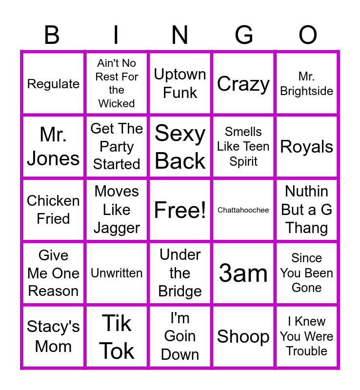 This bingo card has a free space and 24 words: Unwritten, Tik Tok, Sexy Back, Stacy's Mom, Mr. Brightside, Regulate, Mr. Jones, Ain't No Rest For the Wicked, Chattahoochee, Under the Bridge, Smells Like Teen Spirit, Chicken Fried, 3am, Since You Been Gone, Get The Party Started, Shoop, Nuthin But a G Thang, Uptown Funk, Royals, Moves Like Jagger, I Knew You Were Trouble, Give Me One Reason, Crazy and I'm Goin Down.