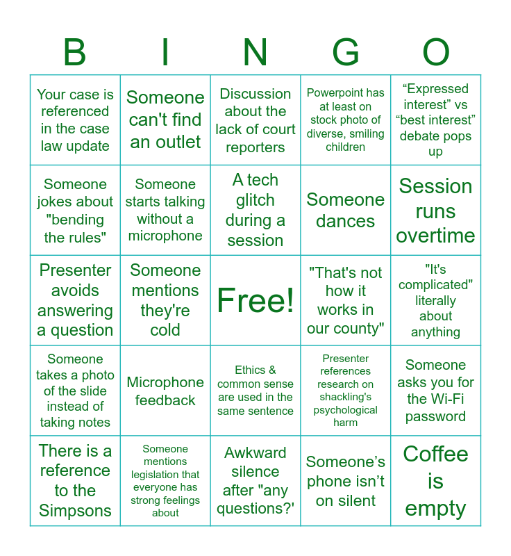 This bingo card has a free space and 26 words: Ethics & common sense are used in the same sentence, Someone’s phone isn’t on silent, A tech glitch during a session, Someone mentions legislation that everyone has strong feelings about, “Expressed interest” vs “best interest” debate pops up, Your case is referenced in the case law update, Someone jokes about "bending the rules", Someone can't find an outlet, "It's complicated" literally about anything, Presenter references research on shackling's psychological harm, Someone dances, Presenter avoids answering a question, Someone asks you for the Wi-Fi password, There is a reference to the Simpsons, Someone mentions they're cold, "We'll need more training on that" is said, Powerpoint has at least on stock photo of diverse, smiling children, Someone takes a photo of the slide instead of taking notes, Discussion about the lack of court reporters, Coffee is empty, Session runs overtime, Awkward silence after "any questions?', "That's not how it works in our county", Microphone feedback, Someone starts talking without a microphone and Someone brings up the lack of attorneys.