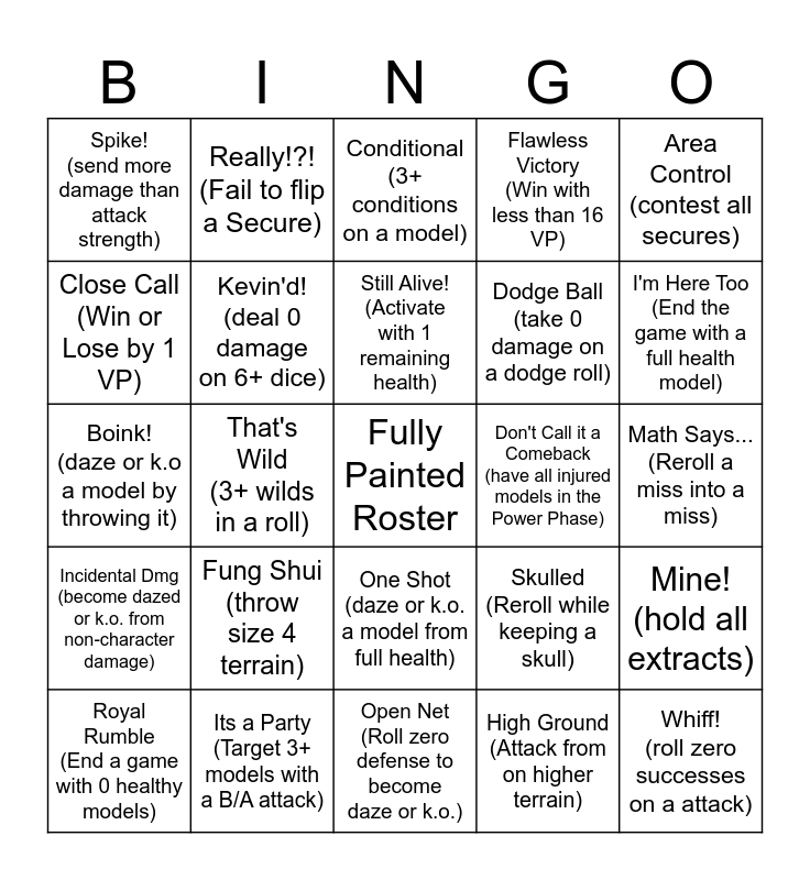 This bingo card has a free space and 24 words: Fung Shui (throw size 4 terrain), Its a Party (Target 3+ models with a B/A attack), Still Alive! (Activate with 1 remaining health), Royal Rumble (End a game with 0 healthy models), Area Control (contest all secures), Spike! (send more damage than attack strength), Close Call (Win or Lose by 1 VP), Really!?! (Fail to flip a Secure), Don't Call it a Comeback (have all injured models in the Power Phase), One Shot (daze or k.o. a model from full health), Dodge Ball (take 0 damage on a dodge roll), Boink! (daze or k.o a model by throwing it), Skulled (Reroll while keeping a skull), Mine! (hold all extracts), Kevin'd! (deal 0 damage on 6+ dice), High Ground (Attack from on higher terrain), Math Says... (Reroll a miss into a miss), Conditional (3+ conditions on a model), I'm Here Too (End the game with a full health model), That's Wild (3+ wilds in a roll), Whiff! (roll zero successes on a attack), Incidental Dmg (become dazed or k.o. from non-character damage), Flawless Victory (Win with less than 16 VP) and Open Net (Roll zero defense to become daze or k.o.).