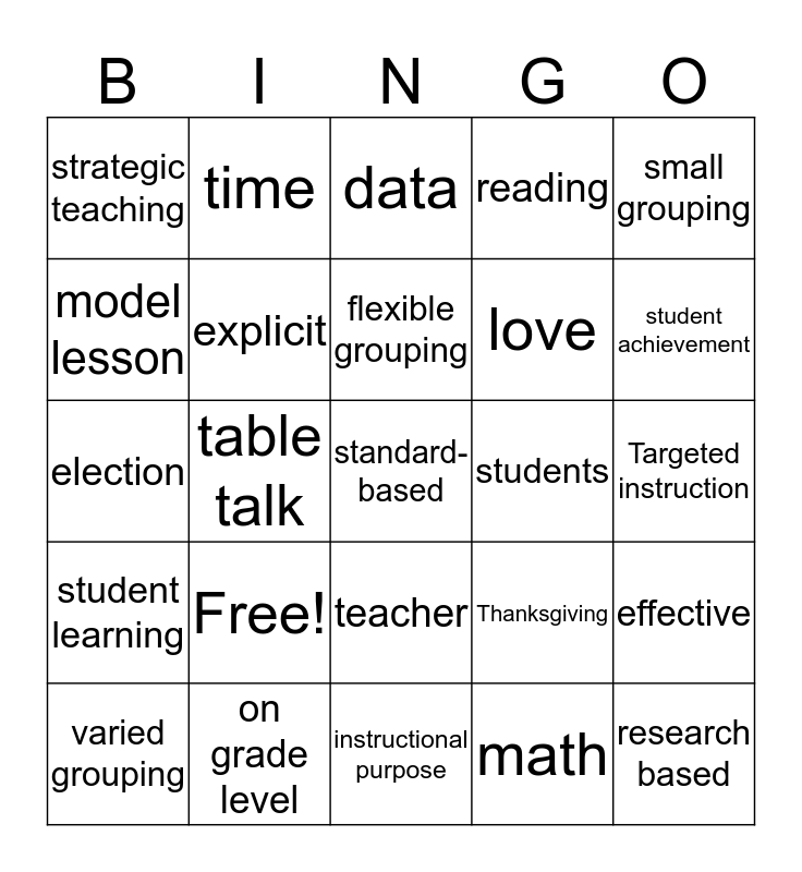 This bingo card has 25 words: Free!, instructional purpose, flexible grouping, varied grouping, small grouping, strategic teaching, model lesson, time, students, teacher, love, election, Thanksgiving, effective, explicit, research based, Targeted instruction, data, student achievement, table talk, standard-based, on grade level, student learning, reading and math.