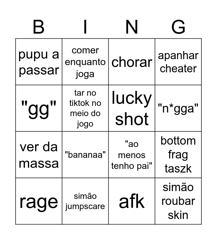 This bingo card has 16 words: simão jumpscare, bottom frag taszk, chorar, pupu a passar, ver da massa, comer enquanto joga, "ao menos tenho pai", afk, "gg", tar no tiktok no meio do jogo, rage, apanhar cheater, "bananaa", "n*gga", lucky shot and simão roubar skin.