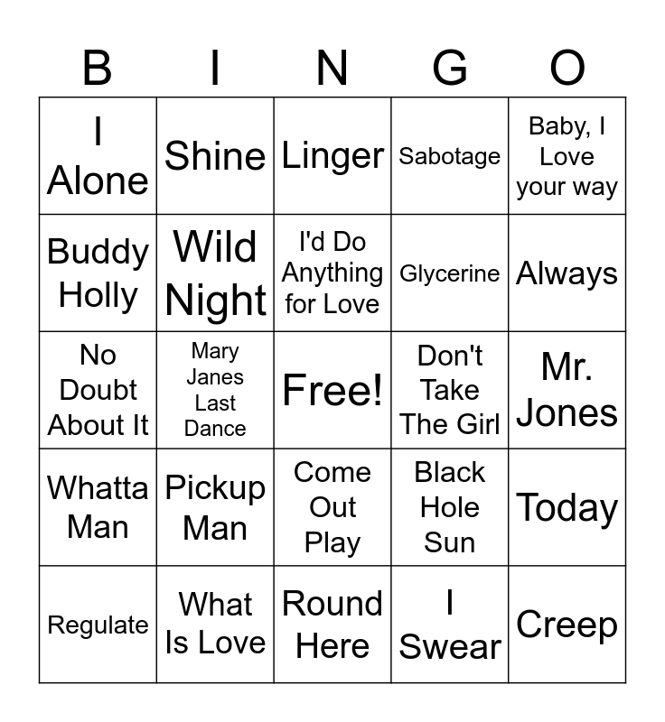 This bingo card has a free space and 34 words: The Sign, I Swear, Stay (I Missed You), Bump n' Grind, Whatta Man, Wild Night, Baby, I Love your way, Regulate, Shine, All I Wanna Do, I'd Do Anything for Love, Linger, Gin and Juice, Tootsee Roll, Don't Take The Girl, Always, What Is Love, No Doubt About It, Pickup Man, Black Hole Sun, Come Out Play, Closer, I Alone, Mr. Jones, Round Here, Creep, Sabotage, Loser, Glycerine, Buddy Holly, Zombie, Mary Janes Last Dance, Today and Better Man.