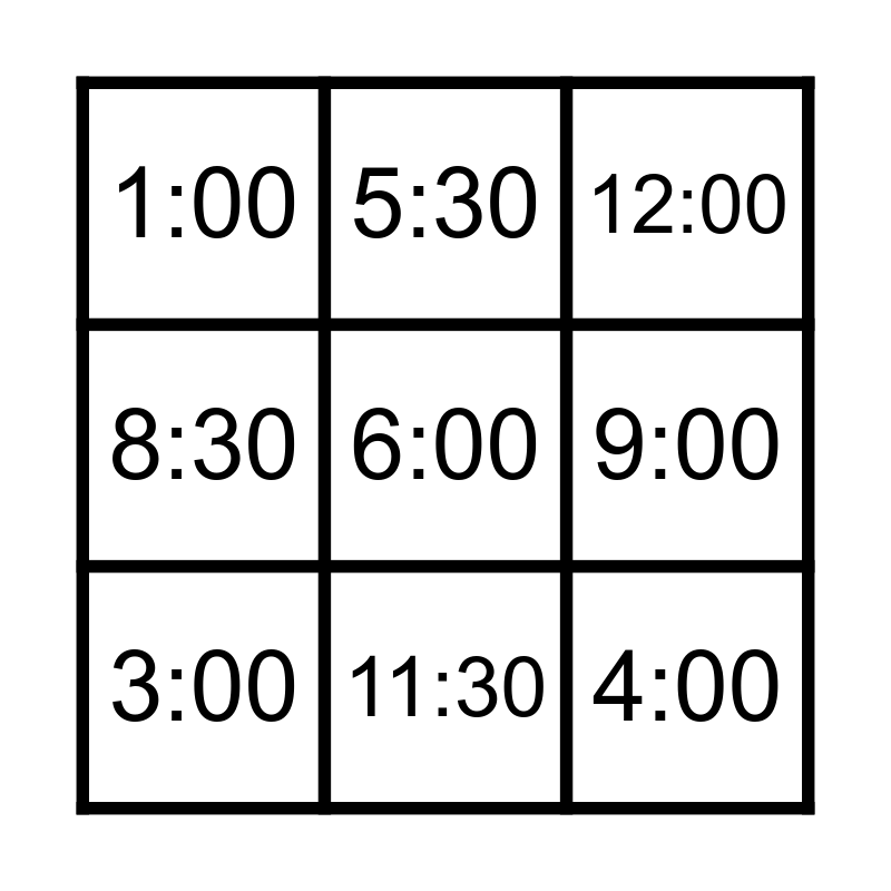 This bingo card has 9 words: 3:00, 12:00, 5:30, 8:30, 1:00, 9:00, 6:00, 4:00 and 11:30.