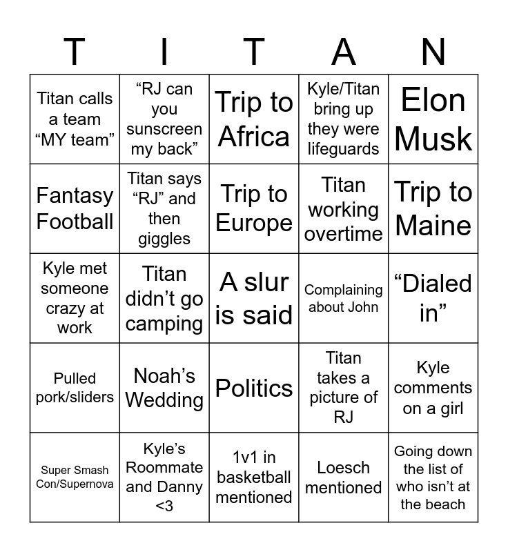 This bingo card has 25 words: Noah’s Wedding, 1v1 in basketball mentioned, Trip to Europe, Super Smash Con/Supernova, Elon Musk, Titan calls a team “MY team”, Fantasy Football, “RJ can you sunscreen my back”, Complaining about John, Politics, Titan working overtime, Kyle met someone crazy at work, Titan takes a picture of RJ, Kyle comments on a girl, Titan says “RJ” and then giggles, Going down the list of who isn’t at the beach, “Dialed in”, Trip to Africa, Trip to Maine, Titan didn’t go camping, A slur is said, Kyle’s Roommate and Danny <3, Pulled pork/sliders, Kyle/Titan bring up they were lifeguards and Loesch mentioned.