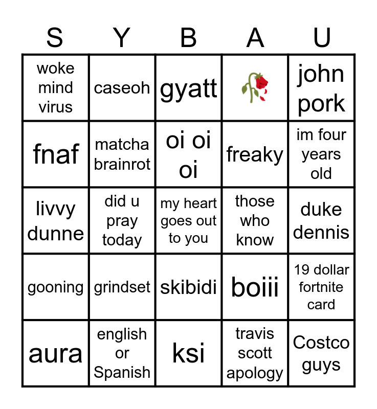 This bingo card has 120 words: fanux tax, alpha, rizz, mogged, alpha, ts, 🥀, kai cenat, 19 dollar fortnite card, edge, dekubapdamdem, sussy, imposter, ohio, quandale dingle, on skib, skibidi, tiktok rizz part, bing chilling, mewing, aura, gyatt, blud, let him cook, beta, gooning, english or Spanish, jelqing, low taper fade, looksmaxxing, travis scott apology, did u pray today, oi oi oi, ei ei ei, ishowspeed, ishowmeat, drake, nonchalant dreadhead, ninja, fortnite, munting, sigma, diddy, 6 7, hawk tuah, lunchly, mr beast, those who know, beta, i like my cheese drippy bruh, why are oranges called orange, eating a burger wit no honey mustard, boiii, lebron, phonk, fortnite, detroit, smyw, cooked, caseoh, ai, Andrew tate, aiden ross, family guy, smurf cat, fnaf, subway surfers, Costco guys, oil up, pomni, livvy dunne, prime, tv man, thick of it, clip farming, yt shorts, freaky, troll face edit, my heart goes out to you, grindset, woke mind virus, jonkler, spongebob, king von, 🗿, ___ before GTA6, ksi, yuno miles, its everyday bro, giga chad, chad, duke dennis, rage bait, nikocado avocado, fein, nickeh30, grimace shake, john pork, chopped chin, i just lost my dawg, red circle/arrow, mango, mustard, j*b application, tuff in india, matcha brainrot, temu, -1000 social credit, +30000 social credit, winter arc, baller, bussing, pause, arcade craniacs, im four years old, youre the youngest person ever!, gurt, linganguliguli, drop shipping and russia.