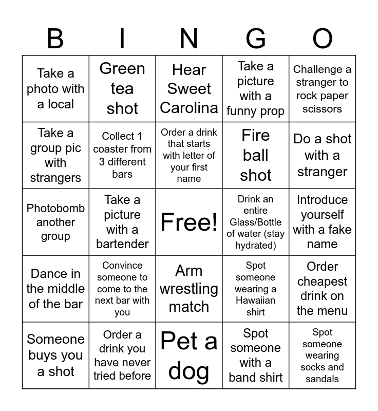 This bingo card has a free space and 24 words: Someone buys you a shot, Convince someone to come to the next bar with you, Order a drink that starts with letter of your first name, Spot someone with a band shirt, Challenge a stranger to rock paper scissors, Take a photo with a local, Green tea shot, Hear Sweet Carolina, Drink an entire Glass/Bottle of water (stay hydrated), Introduce yourself with a fake name, Photobomb another group, Collect 1 coaster from 3 different bars, Spot someone wearing a Hawaiian shirt, Order cheapest drink on the menu, Take a group pic with strangers, Order a drink you have never tried before, Pet a dog, Take a picture with a funny prop, Do a shot with a stranger, Dance in the middle of the bar, Take a picture with a bartender, Arm wrestling match, Fire ball shot and Spot someone wearing socks and sandals.
