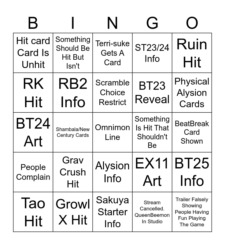 This bingo card has a free space and 24 words: Grav Crush Hit, Growl X Hit, Scramble Choice Restrict, Tao Hit, Ruin Hit, Hit card Card Is Unhit, RK Hit, Something Should Be Hit But Isn't, Something Is Hit That Shouldn't Be, Alysion Info, BT23 Reveal, BT24 Art, EX11 Art, BT25 Info, RB2 Info, Stream Cancelled. QueenBeemon In Studio, BeatBreak Card Shown, Terri-suke Gets A Card, Physical Alysion Cards, Shambala/New Century Cards, Trailer Falsely Showing People Having Fun Playing The Game, People Complain, ST23/24 Info and Sakuya Starter Info.