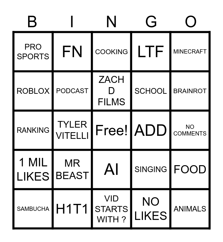 This bingo card has a free space and 24 words: MR BEAST, H1T1, ZACH D FILMS, SAMBUCHA, MINECRAFT, PRO SPORTS, ROBLOX, FN, ADD, AI, SCHOOL, RANKING, SINGING, FOOD, PODCAST, NO LIKES, NO COMMENTS, COOKING, BRAINROT, TYLER VITELLI, ANIMALS, 1 MIL LIKES, LTF and VID STARTS WITH ?.